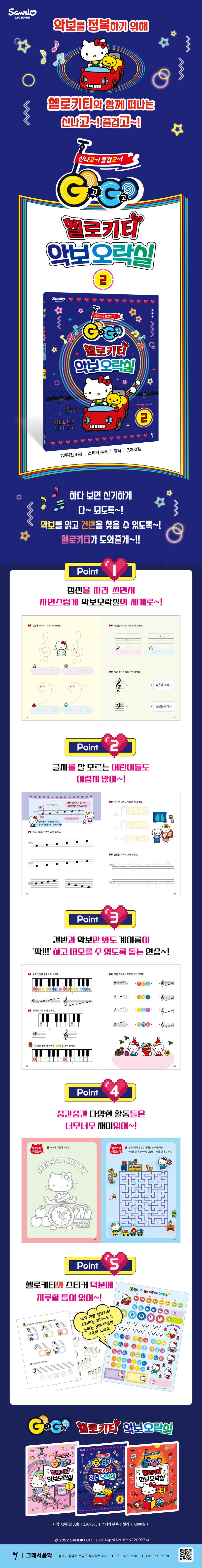 피아노를 처음 배우기 시작하는 아이들을 위해 악보를 읽고 건반을 찾을 수 있도록 돕는 연습장입니다. 헬로키티와 함께 점선을 따라 쓰면서 자연스럽게 익히고 글자를 잘 모르는 어린이들도 불편함 없이 사용할 수 있도록 하는 즐거운 악보오락실로 악보 계이름 읽기에 능숙해져 보세요. “다같이 GO GO~!!”