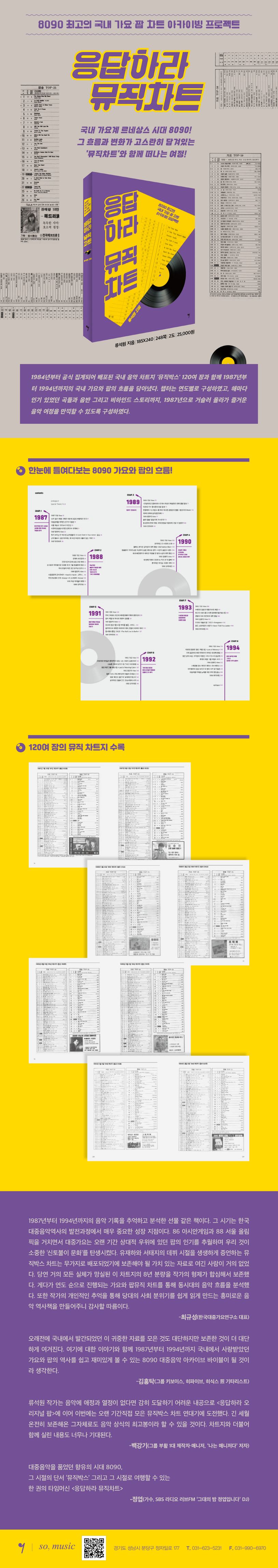 《응답하라 뮤직차트》는 1984년부터 공식 집계되어 배포된 국내 음악 차트지 ‘뮤직박스’ 120여 장과 함께 1987년부터 1994년까지의 국내 가요와 팝의 흐름을 담아냈습니다. 챕터는 연도별로 구성하였고, 해마다 인기 있었던 곡들과 음반 그리고 비하인드 스토리까지, 1987년으로 거슬러 올라가 즐거운 음악 여정을 만끽할 수 있도록 구성하였습니다.