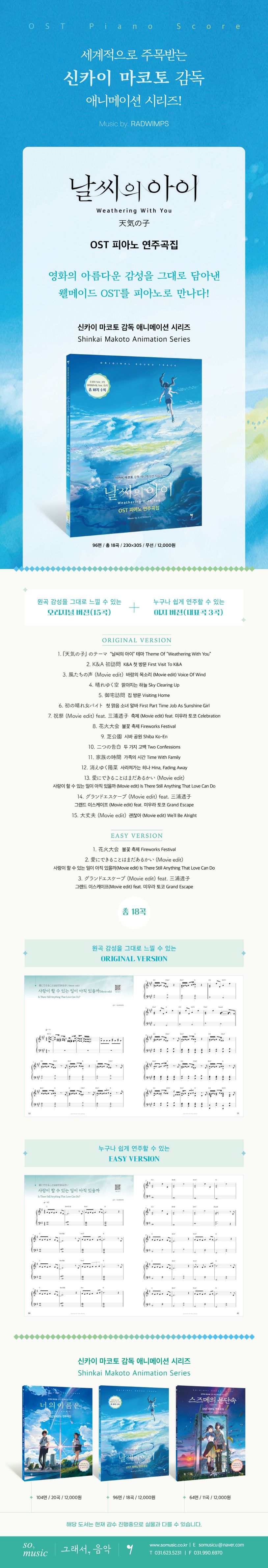 신카이 마코토 x RADWIMPS(래드윔프스) 두 번째 콜라보레이션! 영화 〈날씨의 아이〉 OST를 피아노 스코어로 엮어낸 피아노 연주곡집입니다. 영화의 아름다운 감성과 원곡의 느낌을 그대로 살린 오리지널 버전과 가장 많이 사랑받은 대표곡 3곡을 누구나 쉽게 연주할 수 있는 이지 버전으로 수록하였습니다.