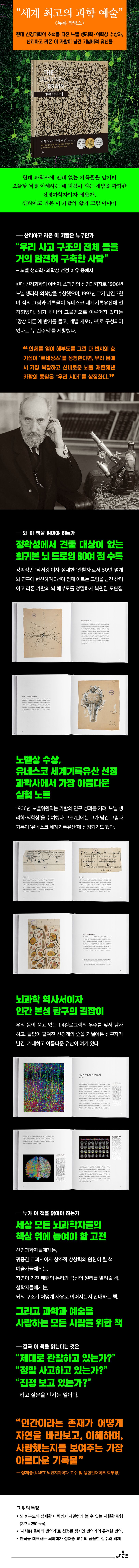《이토록아름다운뇌》에는그의가장대표적인뇌그림인‘대뇌피질의피라미드뉴런’을비롯해대중에게공개된적없는그림까지80여점이수록되어있다.그의그림을통해우리는과학적탐구가어떻게예술로승화할수있는지직접확인할수있다.