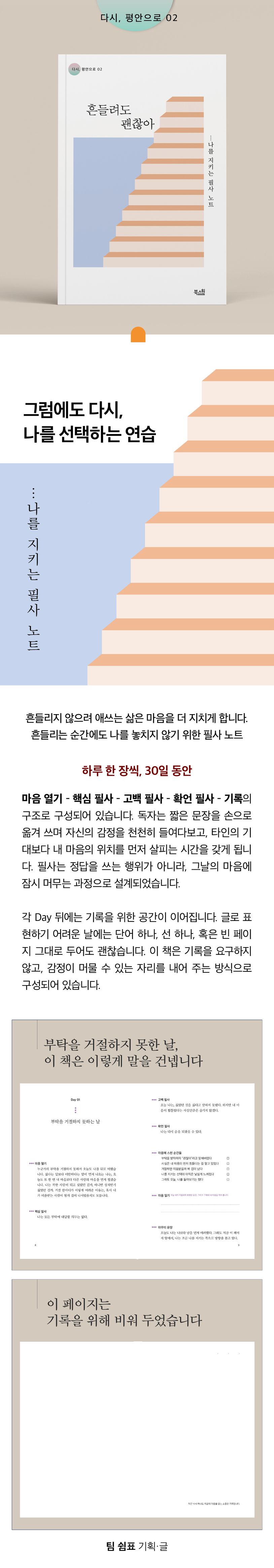 또한 《흔들려도 괜찮아》는 ‘30일 완주’를 목표로 하지 않습니다. 하루를 건너뛰어도, 중간부터 다시 시작해도 무방합니다. 중요한 것은 끝까지 해내는 것이 아니라, 흔들린 뒤에도 다시 돌아올 수 있다는 감각을 잃지 않는 것입니다.