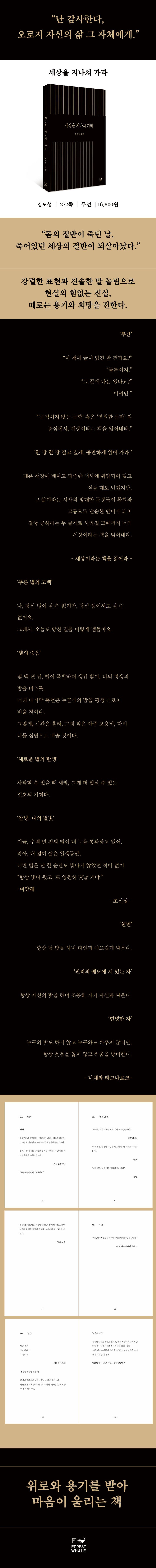 〈세상을 지나쳐 가라〉는 작가가 자신을 구원하고 어려움을 극복한 경험에서 얻은 통찰과 희망을 독자에게 전하고자 한다.