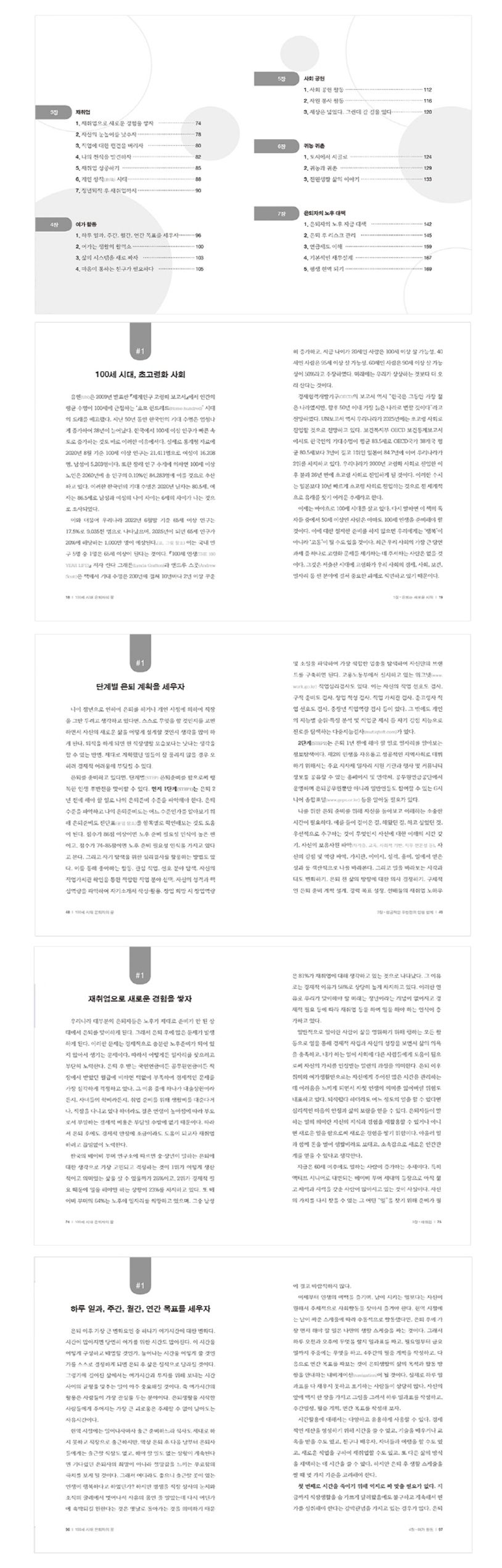 그리고 여기에 기반하여 14개의 장을 통해 기본적인 은퇴 설계 방법, 재취업, 은퇴 후 여가활동, 은퇴 후 사회공헌 활동이나 귀농귀촌, 노후 자금과 연금관리법, 100세 건강 설계법, 평생학습과 자아실현, 배우자 및 자녀와의 관계 재정립, 은퇴 후 주거환경 관리, ‘아모르 파티’와 ‘메멘토 모리’에 기반한 ‘웰 에이징’의 가치관 정립 등 ‘은퇴 후 준비’에 필요한 모든 분야에 걸쳐 체계적이고도 실제적인 실천 방안을 이야기하고 있다.