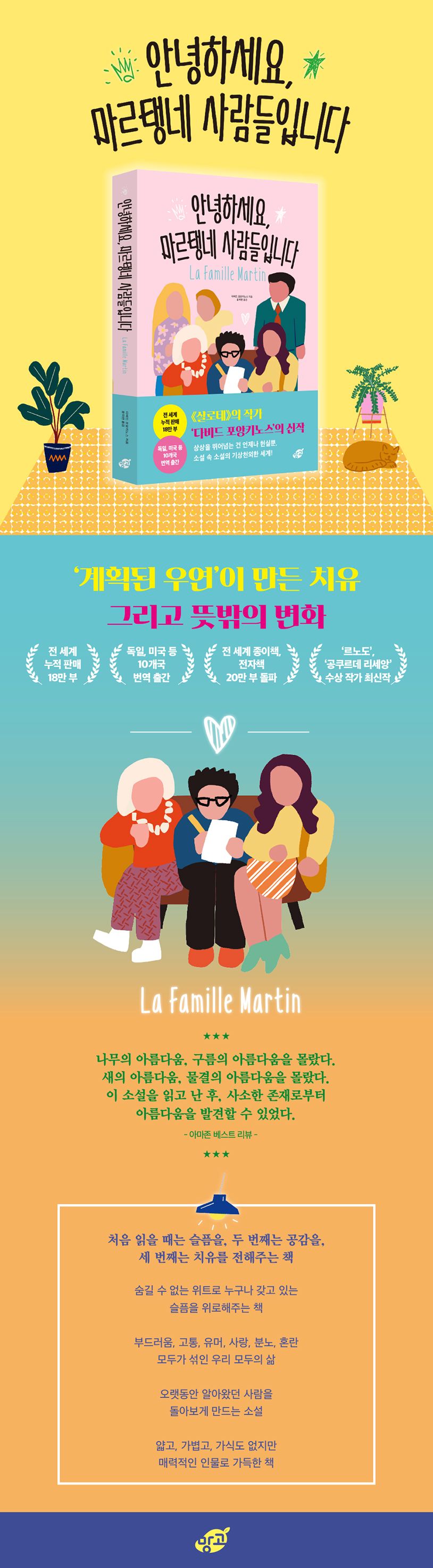 《안녕하세요, 마르탱네 사람들입니다》는 가족과 개인의 삶, 일상과 추억, 사랑, 거기에 글쓰기와 문학에 관한 고뇌에 이르기까지 곰곰이 생각해볼 주제들을 담고 있다. 근사한 표현이 떠오르지 않는다고 너스레를 떨면서 반짝이는 문장들을 선사하는 다비드 포앙키노스는 비소설적이면서도 소설적인 이 책에서 자조 섞인 시선으로 자신의 속살과 우리의 속살을 자세히 들여다본다. 그리고 마침내 전혀 놀랄 일이 없이 반복되는 일상을 살아가는 ‘흔한’ 우리를 그렇게 매혹시킨다.