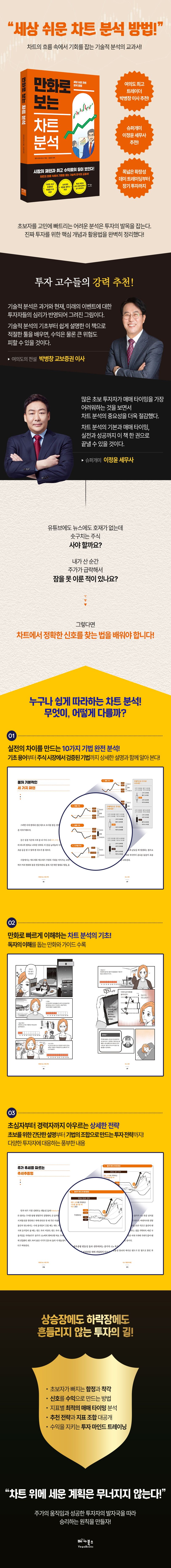 『만화로 보는 차트 분석』은 초보 투자자들이 자신만의 계획을 만들고 정확한 매매의 이유를 찾을 수 있도록 길을 제시한다. 이를 위해 주식 차트의 기초이자 핵심인 봉의 움직임과 이동평균선을 이해하는 법을 비롯해 매매 시점을 포착하여 이익을 최대화하고 손실을 회피하는 다양한 도구들을 소개하고 있다. 10가지 핵심 지표의 조합을 통해 어떤 점을 주시하고 어떤 시기에 매매해야 하는지까지 자세하게 정리했다. 상승장이나 하락장에 거리낄 것 없이 투자자에게 든든한 무기가 되어줄 것이다.