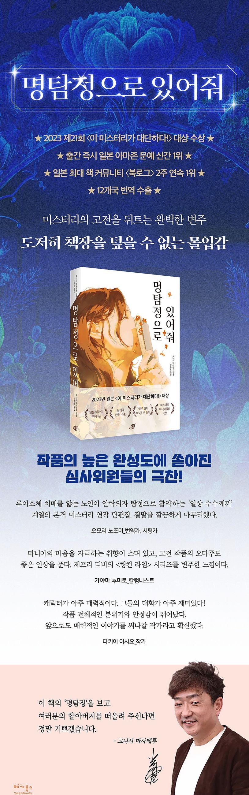 방송작가로 활약하며 첫 작품으로 전 세계 12개국 번역 출간이라는 화려한 데뷔식을 치른 고시니 마사테루의 《명탐정으로 있어 줘》 단순한 미스터리를 넘어, 할아버지와 손녀의 가슴 따뜻한 대화를 읽다 보면 인생을 살아가는 데 필요한 깊이 있는 조언까지 얻을 수 있으리라 확신한다.
