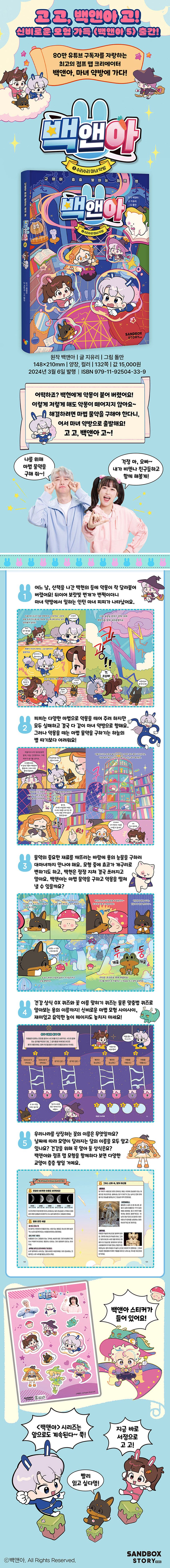 때론 긴장감 넘치고, 때론 웃음이 터지는 모험 사이사이, 재미있는 교양과 상식 그리고 놀이 페이지도 놓치지 마세요. 건강 상식 OX 퀴즈와 꽃 이름 맞히기 퀴즈, 맞춤법 퀴즈로 알아보는 용의 이름까지! 백앤아와 신나게 모험을 즐기다 보면 저절로 교양이 층층 쌓일 거예요.