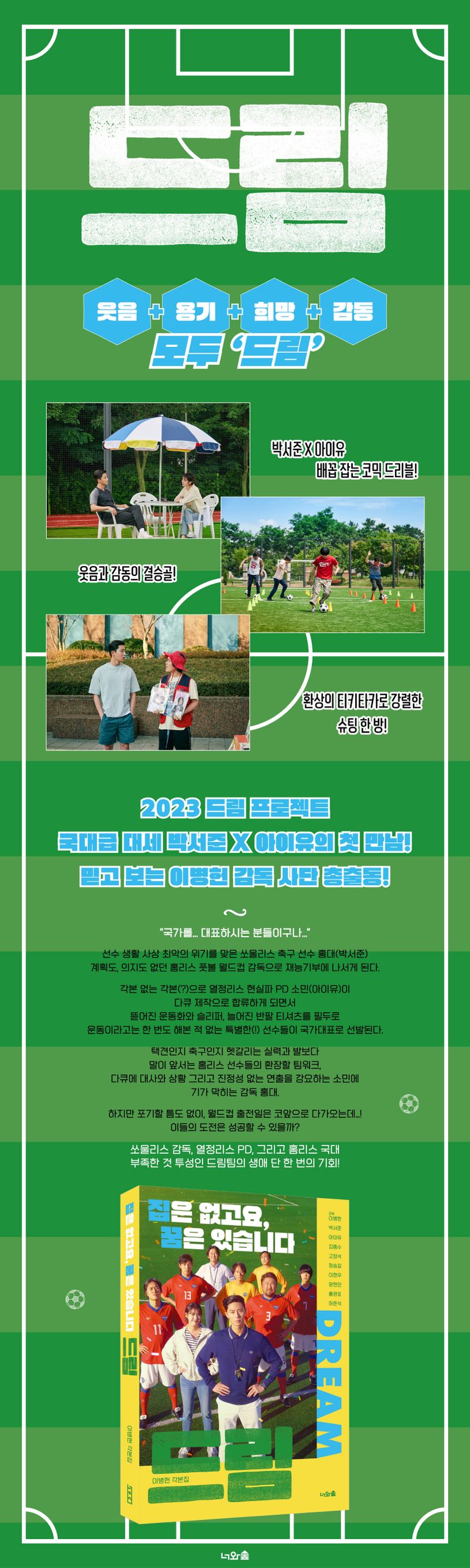 영화 〈드림〉은 박서준과 아이유가 출연한 영화로, 개념 없는 전직 축구 선수 홍대(박서준 분)와 열정 없는 PD 소민(아이유 분)이 집 없는 오합지졸 국가대표 선수들과 함께 불가능한 꿈에 도전하는 이야기를 그린 영화다.