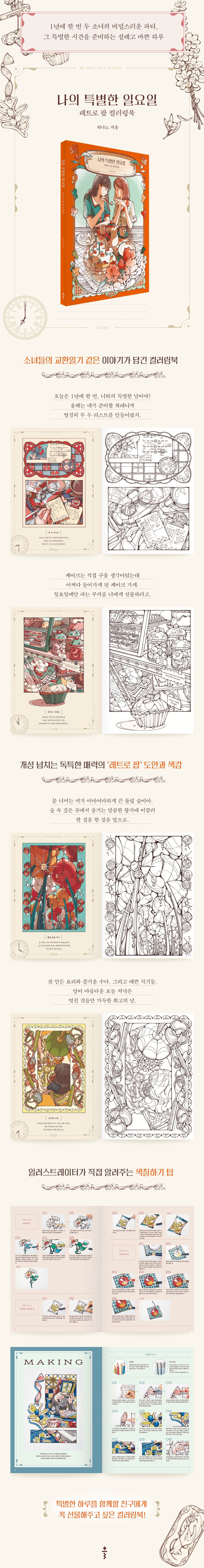 같은 해 어느 봄날에 태어난 두 소녀는 해마다 하루, 생일과 가장 먼 가을날을 정해 둘만의 비밀스럽고 특별한 파티를 열기로 한다. 올해의 파티 준비를 맡게 된 소녀가 파티 당일, 설레는 마음으로 바쁘게 보내는 하루 일과를 담은 《나의 특별한 일요일》은 스토리가 있는 컬러링북이다.