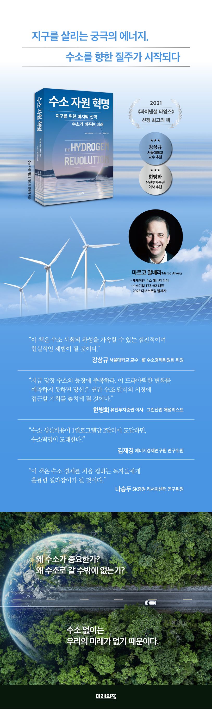 ‘세계적인 에너지 리더’ 마르코 알베라는 이 책을 통해 청정에너지 중에서 수소가 어떻게 미래의 답이 되는지, 전 세계는 왜 수소 기술에 집중할 수밖에 없는지, 방대한 자료를 바탕으로 기술적인 분석과 지정학적인 서사의 유려한 결합을 통해 분명한 답을 제시한다. 마르코 알베라의 20여 년간 에너지 업계 경험이 함축된 이번 책을 통해 당신은 세계의 환경 정책과 에너지 과학과 함께, 넷제로 미래로 향하기 위한 명확한 비전을 탐구하며, 청정에너지 수소가 여는 미래를 발견하게 된다. 그로써 새로운 시대의 경제 흐름을 파악할 수 있는 통찰력을 얻을 수 있을 것이다.