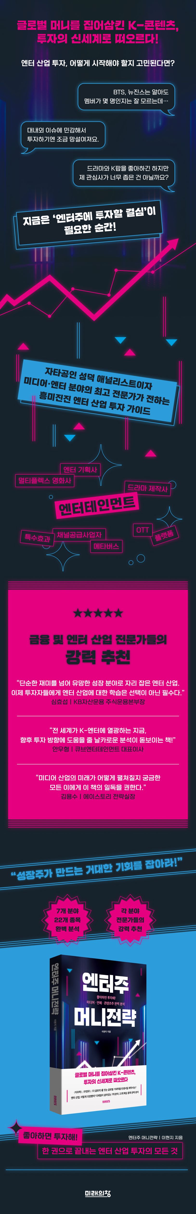 그동안 빠르게 변하는 트렌드 흐름과 흥행 리스크로 인해 엔터 산업 투자를 망설였다면 《엔터주 머니전략》에 주목해보자. 드라마 제작사부터 채널 공급 사업자, OTT, 콘텐츠 플랫폼, 엔터 기획사, 메타버스까지 엔터 산업 전반에 대해 알기 쉽게 다루고 있는 이 책에는 향후 투자 방향에 도움을 줄 실질적인 정보가 가득 담겨있다. 국내 최고의 미디어·엔터 전문 애널리스트이자 오래전부터 K팝의 열성 팬이었던 저자의 진정성은 날카로운 분석에 신뢰를 더해준다. 엔터 산업에 관심은 있는데 어떻게 시작해야 할지 모르는 사람, 일회성 테마가 아닌 엔터 산업의 역사와 전망이 궁금한 사람, 또는 그저 좋아하고 즐기는 것에 투자하고 싶은 사람 그 누구라도 좋다. 책을 펼치는 순간, 성장주가 만드는 거대한 기회가 바로 당신의 눈앞에 펼쳐질 것이다.