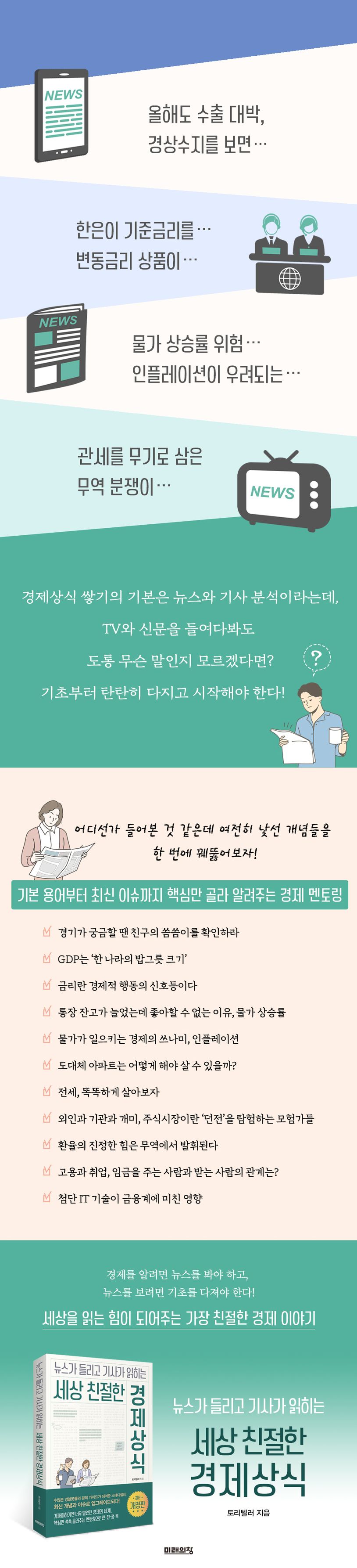 책에 실린 뉴스들은 보도된 당시를 반영한 것이지만, 그 속에 들어 있는 경제 원리들은 과거와 현재, 미래를 관통한다. 앞으로도 경제 뉴스들은 끊임없이 쏟아질 텐데, 이를 제대로 읽어내려면 그 속에 담긴 원리를 파악해서 내 삶에 잘 적용하는 능력을 갖추는 것이 무엇보다 중요하다. 그런 능력을 원하는 경제 초보자들에게 이 책이 든든한 가이드가 되어줄 것이다.