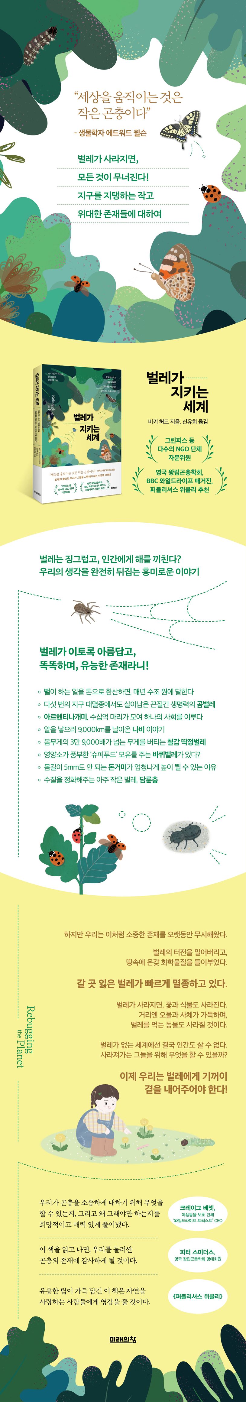 사라져가는 벌레가 다시 돌아오게 하려면 어떻게 해야 할까? 30년 차 환경운동가이자 곤충학자인 저자는 풍부한 예시와 탄탄한 근거로, 무척추동물의 멸종에 영향을 끼친 요인과 그 해결책을 풀어낸다. 핵심은 벌레에게 우리의 곁을 내어주는 것이다. 길가의 잡초와 야생화를 그대로 놔두는 것이나 베란다에서 식물을 키우는 것 등 작은 실천으로도 벌레에게 쉼터와 먹이를 제공해줄 수 있다. 자연을 사랑하는 사람이라면, 이 책을 펼쳐보자. 놀라운 벌레의 세계에서 통찰력을 배우는 것은 물론, 자연을 지탱하는 소중한 존재들을 보호하기 위한 유용한 팁을 얻게 될 것이다.