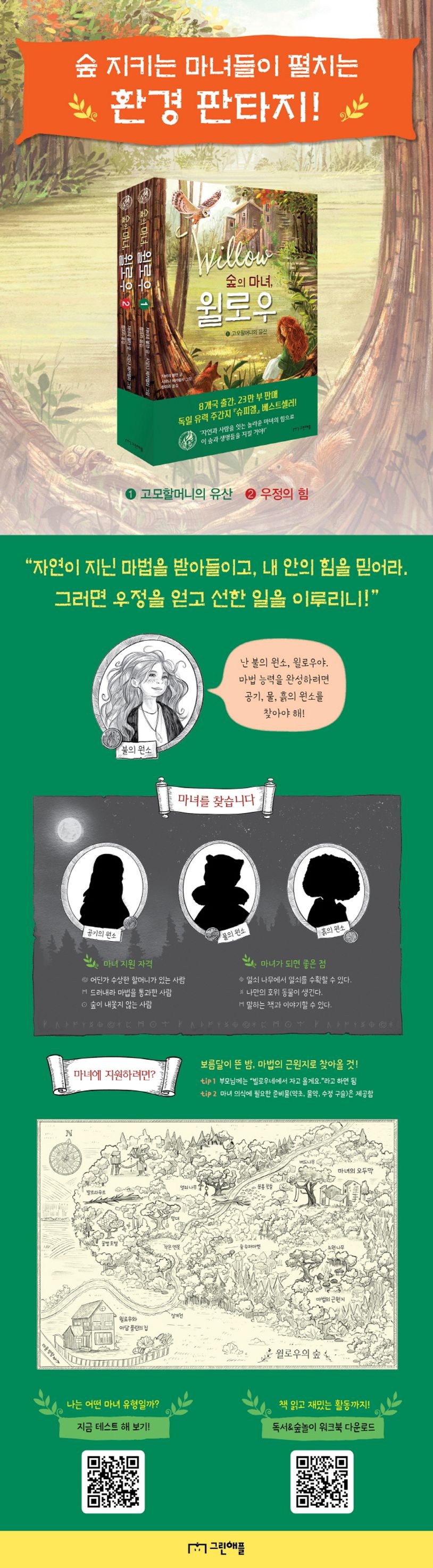 고모할머니께 숲을 상속받은 열두 살 소녀, 윌로우. 숲을 찾은 첫날, 아주 좋은 숲 향기와 안전하게 보호받는다는 느낌이 윌로우를 휘감는다. 마음속에서 오래된 기억이 되살아나고, 윌로우는 붉은 여우에 이끌려 숲속 오두막을 발견한다. 오두막 다락엔 윌로우의 이름(Willow)이 적힌 나무 상자가 놓여 있다. 윌로우는 ‘마음의 소리’에 귀를 기울여 상자에 맞는 열쇠를 ‘열쇠 나무’에서 따 온다. 나무 상자 안에는 알비나 고모할머니가 남긴 편지와 마녀의 책, 마녀 의식을 위한 마법 도구들이 들어 있고, 윌로우는 고모할머니가 숲뿐 아니라 마법 능력도 물려주었다는 걸 깨닫는다.