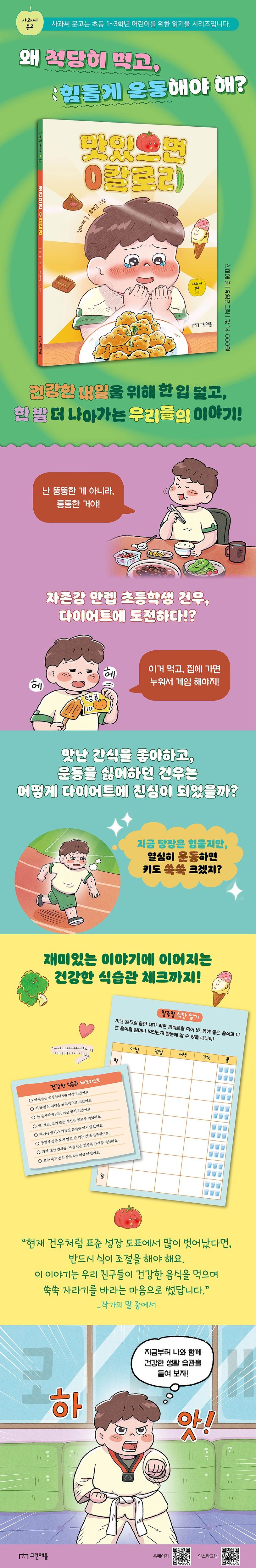 건우 역시 갑작스러운 엄마의 온 가족 다이어트 선언을 처음에는 받아들이지 못하지만, 차츰 엄마가 무엇을 걱정하는지 진심으로 이해하면서 간식도 줄이고, 운동도 열심히 하게 돼요. 지금부터 《맛있으면 0칼로리》 속 건우와 함께 식습관을 포함해 건강한 생활 습관을 배우고 익혀 볼까요?