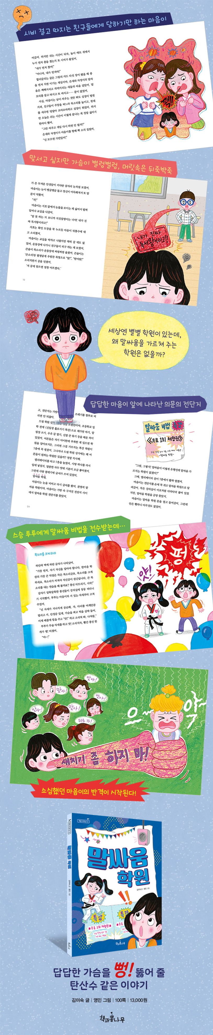 책콩 저학년 12 『말싸움 학원』은 소심했던 아이가 말싸움 기술을 익혀 당당하게 자기주장을 펼치기까지의 이야기를 그립니다. 답답했던 가슴이 뻥! 뚫리는 비법을 익혀 보세요!