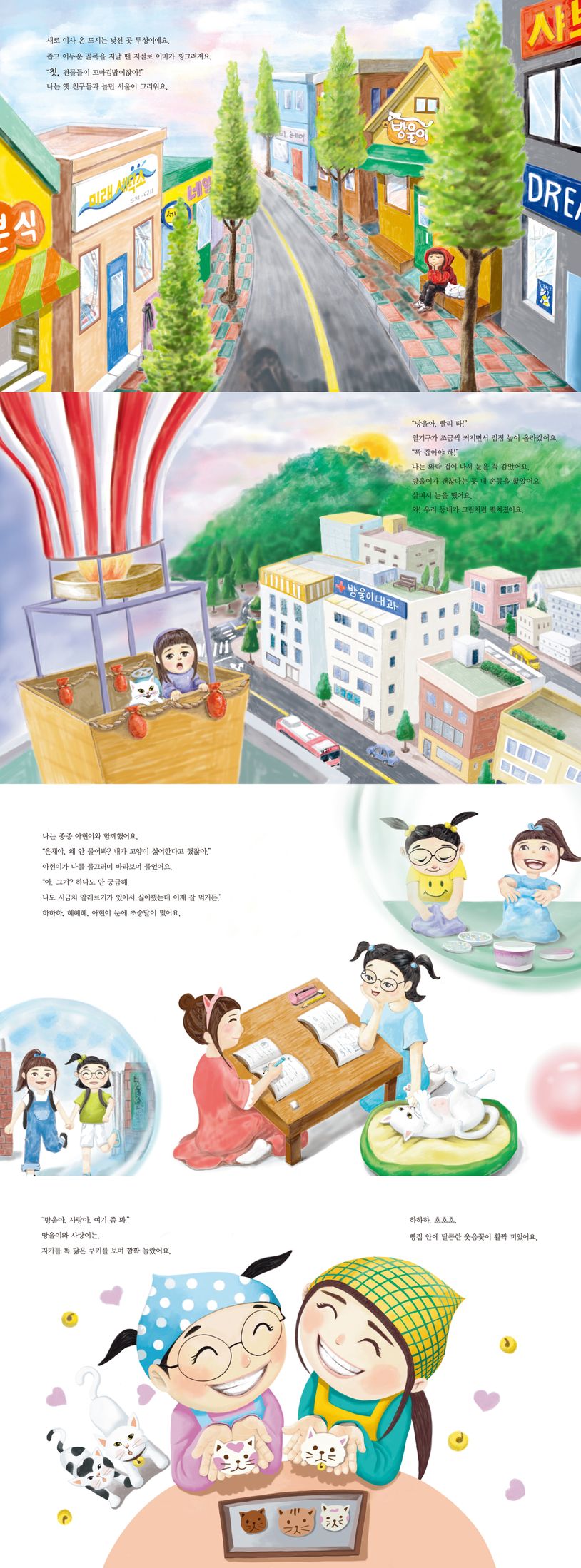 은채는 새로 이사 온 낯선 도시에서 친구 아현이를 만납니다. 아현이는 묻지도 않았는데 “고양이 알레르기가 있다”며 고양이가 싫다고 합니다. 고양이 ‘방울이’를 키우는 은채는 아현이가 몹시 얄밉습니다. 그러다 은채는 아현이의 마음 속 상처를 알게 됩니다. 아현이가 엄마에게 “그동안 지나가는 고양이만 봐도 눈물이 났어요. 무지개다리 건넌 우리 키티에게 너무 미안했거든요.”라며 울먹이는 소리를 들었기 때문입니다. 은채는 고양이가 싫다고 거짓말을 할 수밖에 없는 아현이의 마음을 따뜻하게 안아주며 “나도 시금치 알레르기가 있어서 싫어했는데 이제 잘 먹는다.”고 말합니다. 은채는 방울이가 낳은 새끼 고양이 ‘사랑이’를 잘 키워달라며 아현이의 품에 살포시 안겨 줍니다. 이처럼『방울 방울 사랑이』는, 상처받은 친구의 슬픔을 위로와 사랑으로 감싸주는 것이 얼마나 소중한지 말하고 있습니다.