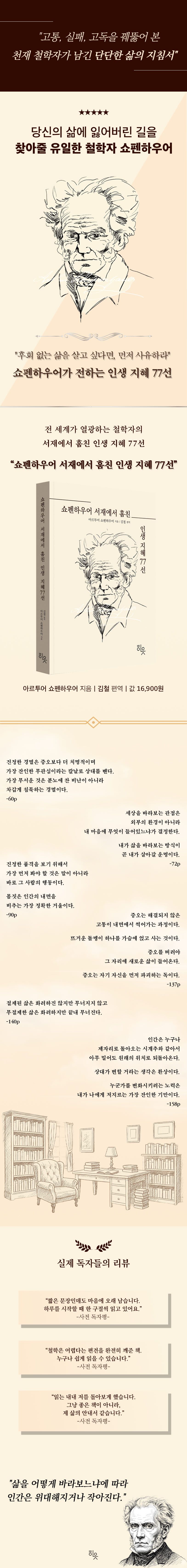 니체, 톨스토이, 바그너, 프로이트 등 철학가부터 심리학자까지 시대의 거장들은 하나 같이 모두 쇼펜하우어의 생각을 탐냈다. 이 책은 쇼펜하우어의 저서에서 현대인에게 가장 도움이 될 만한 주제 77개를 엄선하여 편역했다.