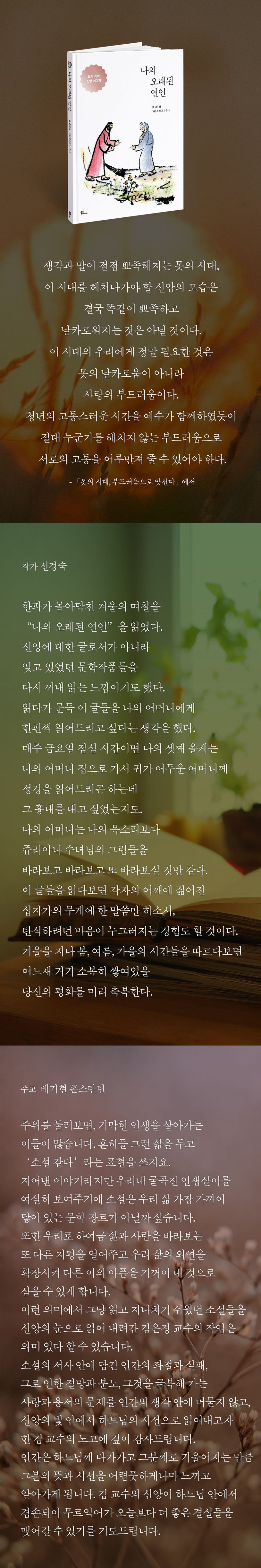 이렇게 부족한 마음에서 쓴 글이면서도, 3년 연재를 마치고 책으로 묶을 용기를 낸 것은 ‘글 참 잘 읽고 있다’는 주위의 성원 덕분이다. 글에서 소개한 소설을 꼬박꼬박 찾아 읽는다는 분, 우리 문학에 이렇게 다양한 신앙 이야기가 있는지 처음 알았다는 분, 그리고 나의 글을 참 좋아하시는 연로한 우리 엄마. ‘성원에 보답한다’는 멘트는 식상하지만, 이것이 책을 묶는 나의 솔직한 심정이다.