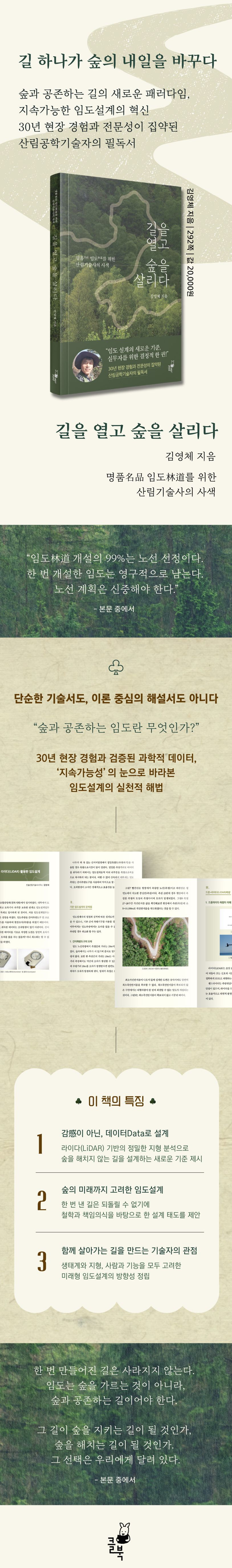 “이제는 과거의 임도측량 방식을 과감히 버려야만 임도 발전이 가능하다. 이 책이 대한민국 임도林道 공학의 기술 발전에 기여할 뿐만 아니라, 한 걸음이 아닌 두세 걸음 더 도약하는 계기가 되기를 기대한다.” -저자 김영체