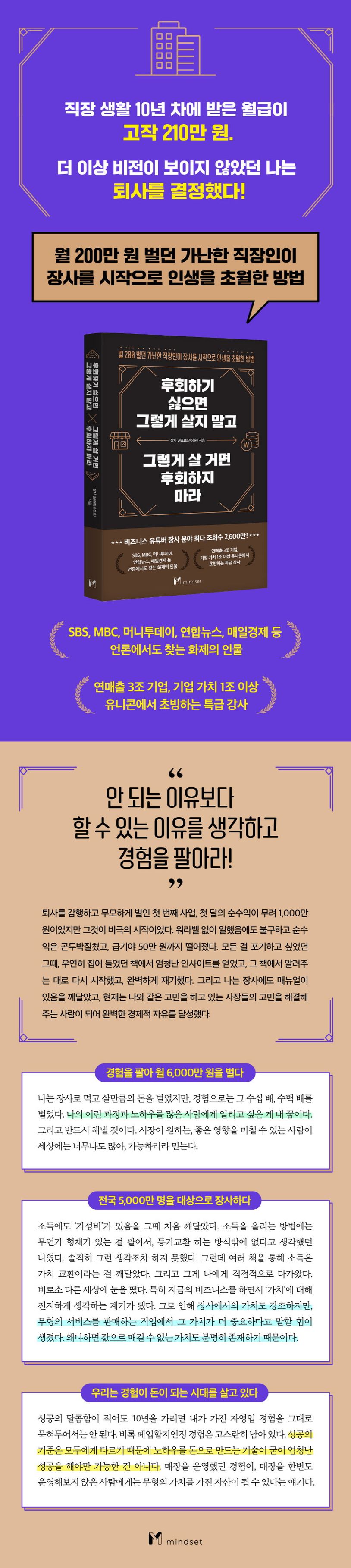 직장 생활 10년 차에 받은 월급이 고작 210만 원. 더 이상 비전이 보이지 않았던 저자는 퇴사를 감행한다. 그리고 늘 꿈만 꿨던 나만의 사업, ‘장사’를 시작한다. 그렇게 시작한 장사로 얻은 첫 달 순수익이 무려 1,000만 원. 순식간에 축제 분위기가 됐지만, 그것이 비극의 시작이 될 줄은 아무도 몰랐다. 매일 좌석이 꽉 찬데다가, 1,000만 원이라는 숫자가 머릿속을 떠나지 않아 계산하지 않고 퍼준 것이 화근이었다. 두 번째 달부터 수익이 점차 떨어지기 시작하면서, 급기야 순수익 50만 원까지 곤두박질친다. 결국, 폐업 위기까지 갔던 저자는 우연히 집어 든 책 속 “안 되는 이유보다 할 수 있는 이유를 생각하라.”는 문장에서 동기부여를 받아 다시 일어선다. 책에서 알려주는 대로, 직접 실행으로 옮김으로써 장사에도 매뉴얼이 있음을 깨달았고, 그것을 바탕으로 재기해 사장들의 고민을 해결해주는 사장이 됐다. 더불어 가치를 판매하기 시작하면서, 장사할 때보다 더 많은 장사를 하고 있는 저자는 본인의 경험을 팔라고 강조한다.