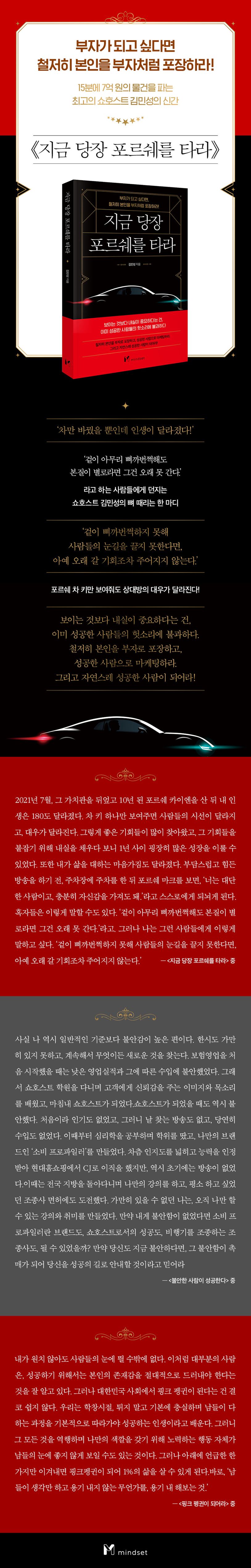 불안정한 직업 특성상, 쓸데없는 곳에 나가는 지출을 줄이고 내실을 다지려 노력했던 저자는, 친한 선배의 한 마디에 인생의 가치관을 바꿔버린다. 그리고 그는 그 가치관으로 인해 훨씬 더 많은 기회를 얻게 됐고, 이전보다 훨씬 더 나은 삶을 살게 됐다. ‘지금 당장 포르쉐를 타라’의 저자 김민성은, 미지근한 삶을 살바에야 차라리 뜨겁거나 차가운 삶을 살겠다고 말한다. 어떻게든 관심을 끌어야 그 다음 기회라도 주어지는 이 냉정한 세상에서 그는, 어떻게 하면 사람들의 관심과 호감을 얻고, 그 관심과 호감을 기회로 치환하는지에 대한 구체적인 방법을 알려준다.