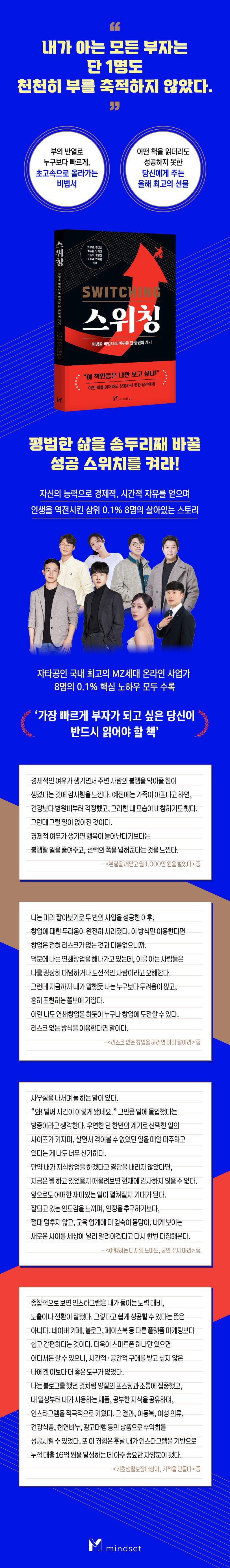 그런데도 그 어떤 책을 읽어도 성공하지 못했다면, 『스위칭』을 선택하길 바란다. 오로지 자신의 능력으로 인생을 역전시켜 경제적ㆍ시간적 자유를 얻음과 동시에, 각 분야 상위 0.1%라는 수식어를 달성한 8명의 살아있는 인생 스토리와 핵심 노하우를 알차게 담아 두었으니 말이다.