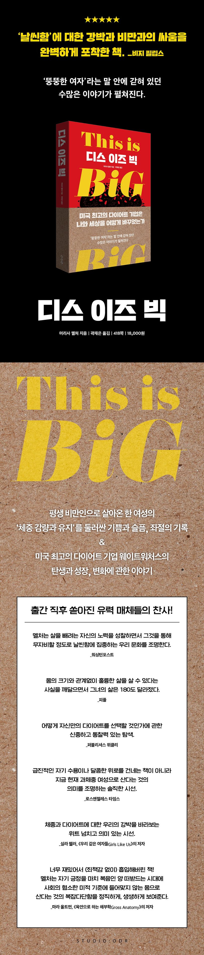 출간 직후 유력 매체들의 쏟아지는 찬사를 받은 《디스 이즈 빅(This is Big)》은 누군가의 몸을 ‘비만’ 혹은 ‘정상’으로 단순하게 정의할 수 없듯 한마디로 정의할 수 없는 독특한 매력을 지닌 책이다. 웨이트워처스 설립자 진 니데치의 일대기이자 머리사 멜처 자신의 다이어트 경험담을 진솔하게 담은 에세이, 1960년대부터 2010년대까지의 미국 식품 산업과 여성 인권을 둘러싼 사회적·역사적 맥락의 기록이자 몸과 나의 관계 혹은 음식과 나의 관계에 질문을 던지고 답을 찾아나가는 인문서의 성격까지 갖추고 있다.