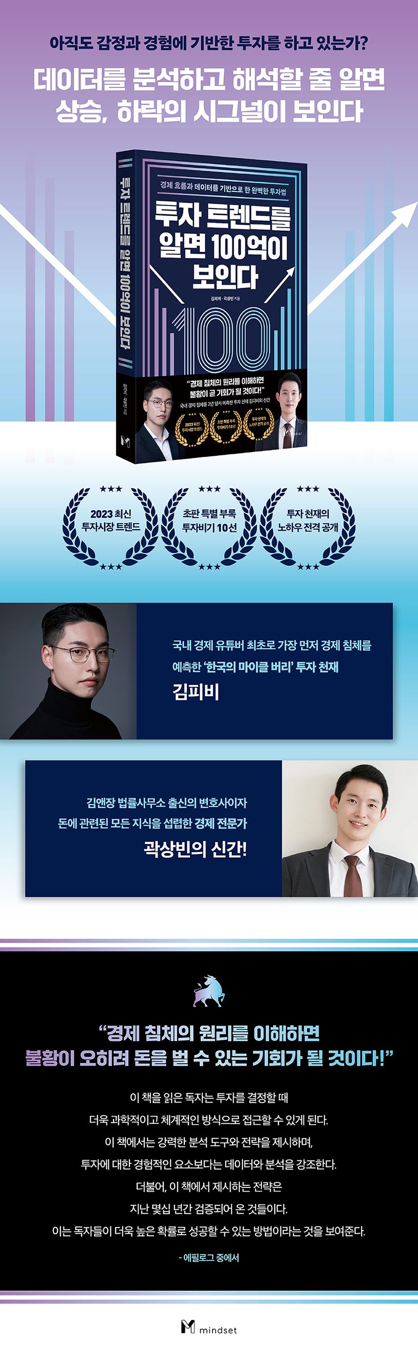 이미 2년 전 경기 침체, 은행의 부도, 자산 가격의 폭락, 암호화폐 거래소의 파산 등을 예측해 ‘한국의 마이클 버리’라는 별명을 얻은 투자 천재 김피비와 김앤장 법률사무소 출신의 변호사이자 회계사 곽상빈의 신간 『투자 트렌드를 알면 100억이 보인다』가 출간되었다.