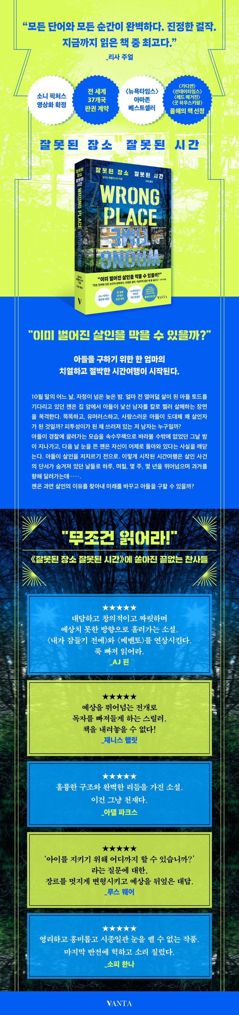 머릿속에 선명하게 그려지는 장면 묘사, 군더더기 없이 빠르게 전개되는 스토리, 곳곳에 뿌려놓은 단서들이 빈틈없이 맞물리면서 무릎을 치게 만드는 치밀한 반전, 가족 간의 애틋한 사랑을 특징으로 하는 《잘못된 장소 잘못된 시간》은 소니 픽처스에서 영상화가 확정되었음은 물론 출간된 해에 〈가디언〉, 〈선데이타임스〉, 〈레드 매거진〉, 〈굿 하우스키핑〉 올해의 책에 선정되었고, 〈RADIO 2〉 이달의 책, 〈옵서버〉 이달의 스릴러, 영국 대표서점 워터스톤즈 3월의 스릴러 도서, 아마존 에디터가 선택한 2022년 최고의 책 중 하나에 꼽히는 등 매체와 동료 작가, 독자들의 사랑을 한몸에 받은 작품이기도 하다. 책이 출간된 지 1년이 넘은 지금까지도 미국과 영국에서 100만 부 가까운 판매고를 올리고 있을 뿐 아니라 ‘브리티시 북 어워드 2023 범죄 스릴러 부문’ 최종 후보, 영국 최고의 범죄 소설상 중 하나인 2023년 ‘Old Peculier crime novel of the year’ 최종 후보에 선정되는 등 그 인기와 화제성을 이어가고 있다.