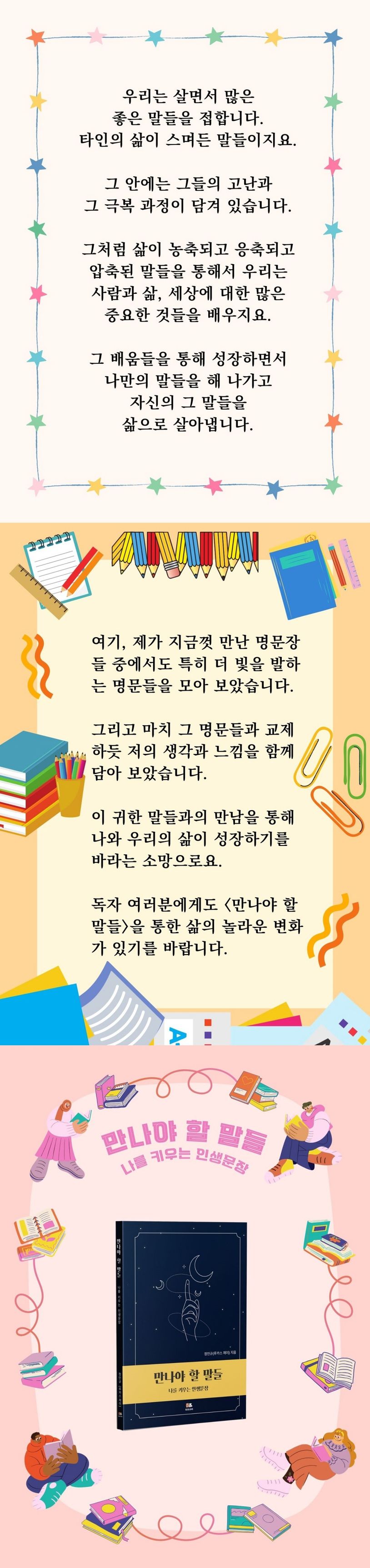 여기, 제가 지금껏 만난 명문장들 중에서도 특히 더 빛을 발하는 명문들을 모아 보았습니다. 그리고 마치 그 명문들과 교제하듯 저의 생각과 느낌을 함께 담아 보았습니다. 이 귀한 말들과의 만남을 통해 나와 우리의 삶이 성장하기를 바라는 소망으로요.