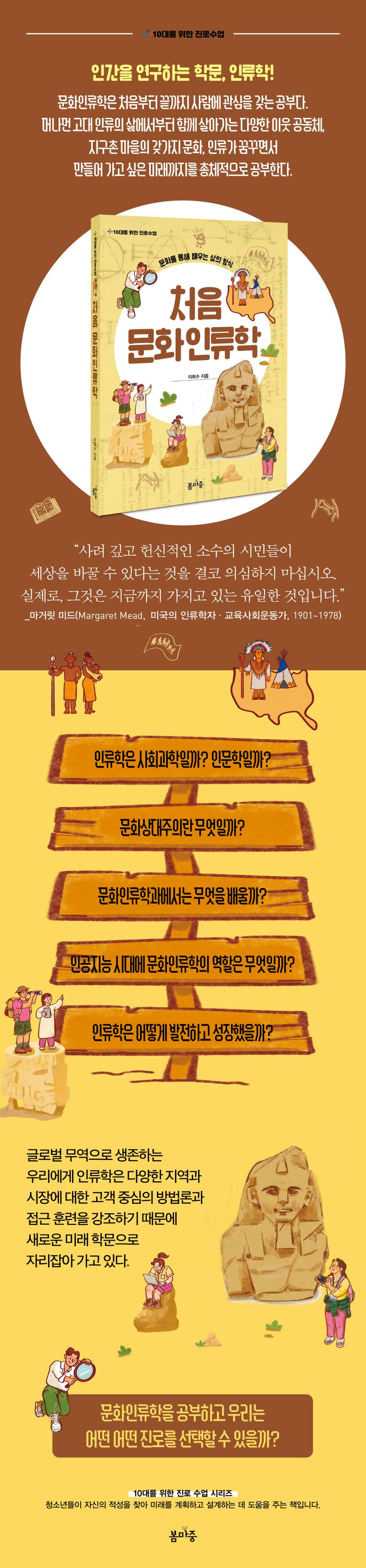 봄마중의 〈10대를 위한 진로수업〉 시리즈는 청소년들이 자신의 적성을 찾아 미래를 계획하고 설계하는 데 도움을 주기 위해 기획되었다. 《처음 지리학》에 이어, 여섯 번째로 출간된《처음 문화인류학》은 한양대학교 문화인류학과의 이희수 명예교수가 문화인류학의 전반에 대해 소개한 책이다. 문화인류학은 과연 어떤 학문인지, 문화인류학의 역사는 어떻게 되는지, 문화인류학은 무엇을 탐구하는 학문인지, 문화인류학과에서는 무엇을 배우며, 문화인류학을 전공하고 나서는 어떤 진로를 선택할 수 있는지 조목조목 살펴볼 수 있어, 청소년들의 진로 선택에 도움이 될 것이다.