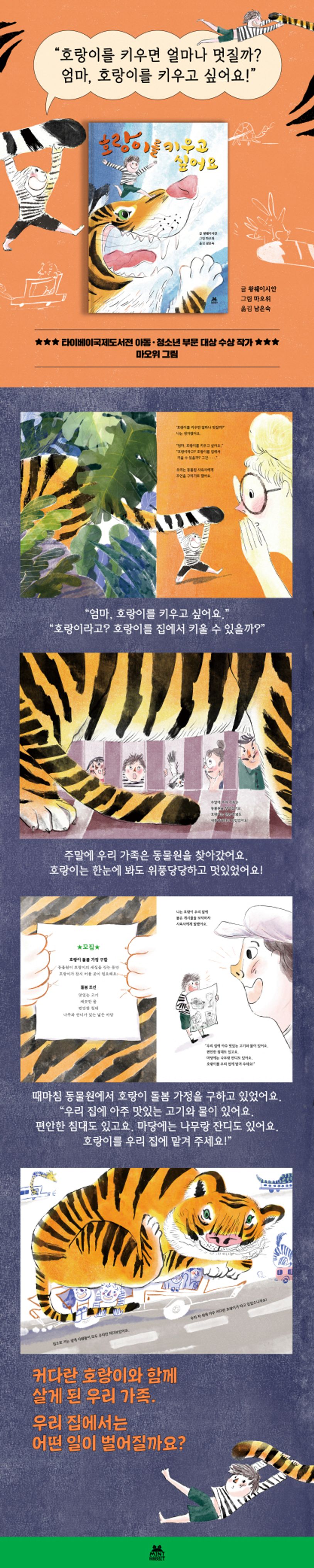 『호랑이를 키우고 싶어요』를 쓴 작가 왕웨이시안은 유치원 교사로 일하면서 아이들에게 호랑이가 얼마나 매력 있는 동물인지 알았습니다. 그래서 애완동물로 호랑이를 키우고 싶어 하는 아이들의 소원을 이루어 주는 대신 애완동물을 키우려면 무엇이 필요한지 아이 스스로 생각할 수 있는 이야기를 구상하였습니다. 아이들의 상상력을 지켜 주면서 책임감도 심어 주는 어른의 지혜입니다. 그 이야기를 타이베이국제도서전 아동·청소년 부문 대상 수상 작가인 마오위가 마치 호랑이가 튀어나올 듯한 생동감 넘치는 그림으로 담았습니다. 『호랑이를 키우고 싶어요』를 읽으며 우리 아이들은 어떤 애완동물을 키우고 싶어 하는지, 그 동물을 집에서 키우기 위해서는 어떤 것들이 필요한지 함께 이야기 나누어 보세요.