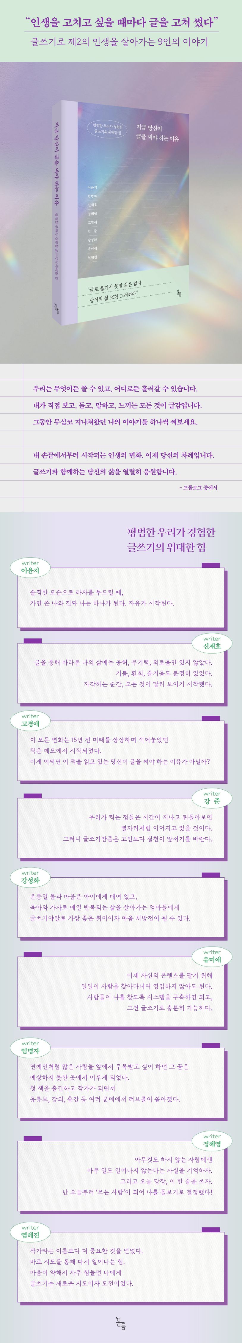 글쓰기로 인생이 달라질 수 있을까? 이 물음에 주저 없이 “물론이다”라고 답하는 9인이 모여 『지금 당신이 글을 써야 하는 이유』를 썼다. 30대부터 60대까지 나이도 직업도 다른 아홉 작가의 공통점은 꾸준하게 글을 쓰며 삶의 변화를 스스로 이루어냈다는 점이다. 이들의 삶이 곧 ‘지금 당신이 글을 써야 하는 이유’ 그 자체이다.