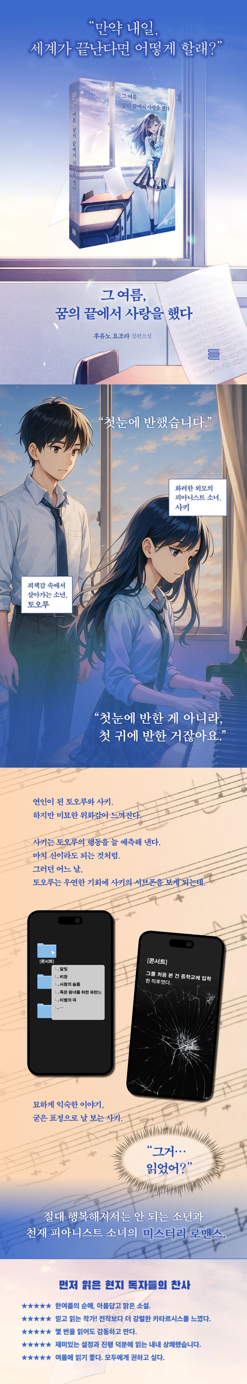 미스터리와 로맨스의 절묘한 하모니를 담아낸 『그 여름, 꿈의 끝에서 사랑을 했다』. 후유노 요조라만의 독특한 세계를 만난다.