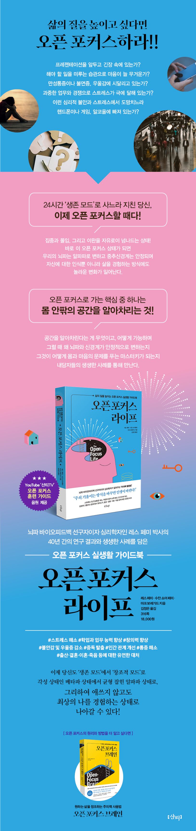 이제,공간에대한의식적인알아차림을통해주변세상과물리적으로연결되고주의력의힘을최대치로발휘해더욱자유로운삶을누리는이‘오픈포커스존재상태’에,그리고그것을앞서경험한사람들의이야기에여러분을초대한다.