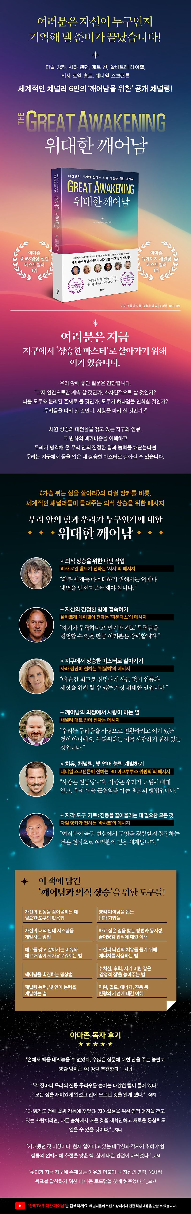 6명의채널러들이정보를받는존재들은저마다다르고,그래서각기다른목소리로말하지만,모두우리의진동주파수를높이고의식상승을이끈다는점에서,또우리가누구이고,어떤힘을가지고있으며,스스로의힘에접속할열쇠가우리안에있다는것,그리고이러한깨어남이각개인의여정에서그치는것이아니라지구전체의의식상승과관련이있다는점으로수렴한다는점에서모두하나의채널에서나온것처럼일관되고,모두우리의영감을깨우는메시지들이다.