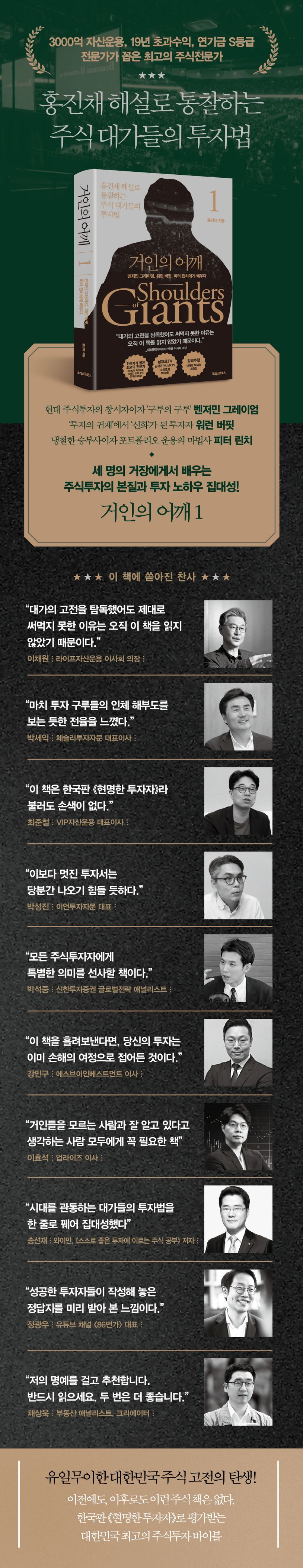 홍진채 저자의 해설로 살펴보는 시대를 관통하는 주식 대가들의 투자 철학과 투자법 탐구. 《거인의 어깨》는 총 3권으로 기획되었으며, 1권과 2권을 동시에 출간하고 3권은 2023년에 선보일 예정이다. 1권에서는 벤저민 그레이엄, 워런 버핏, 피터 린치의 투자법을 원점에서 살피고 대가들의 투자법을 실전에서 구현하기 위한 방법을 살펴본다. 세 명의 거장의 사고 체계를 해체하고 다시 조립하는 과정에서 주식이란 도대체 무엇인지, 주식은 어떤 가치를 지니며, 가치와 가격의 관계는 어떠하며, 투자자로서 각 개인이 이 관계를 통해 돈을 벌기 위해서는 기업의 어떤 요소에 집중해야 하는지 그리고 어떤 요소는 무시해야 하는지를 살펴 나만의 투자 사고 체계를 정립하도록 돕고 있다.