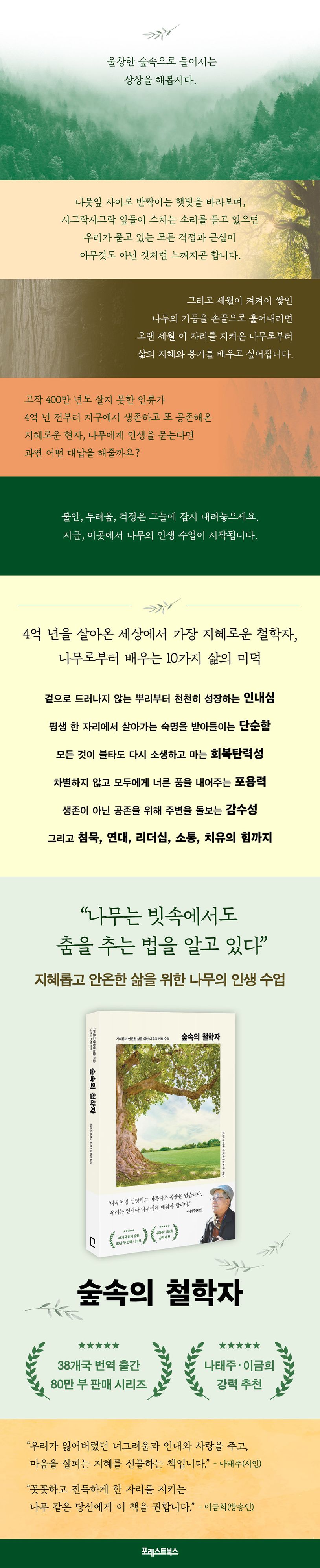단단하게 제 모습을 지켜내면서도 그 누구보다 유연하고 조화로운 나무의 삶을 보여주며, 나무의 가르침을 삶에 적용할 수 있는 구체적인 지침까지 안내하는 이 책 『숲속의 철학자(원제: 나무처럼 행동하고 생각하라Agir et penser comme un arbre)』는 전 세계 38개국에서 번역 출간되고, 80만 부 넘게 판매된 시리즈의 화제작으로 수많은 이의 삶을 지혜롭고 평화롭게 이끌고 있다.