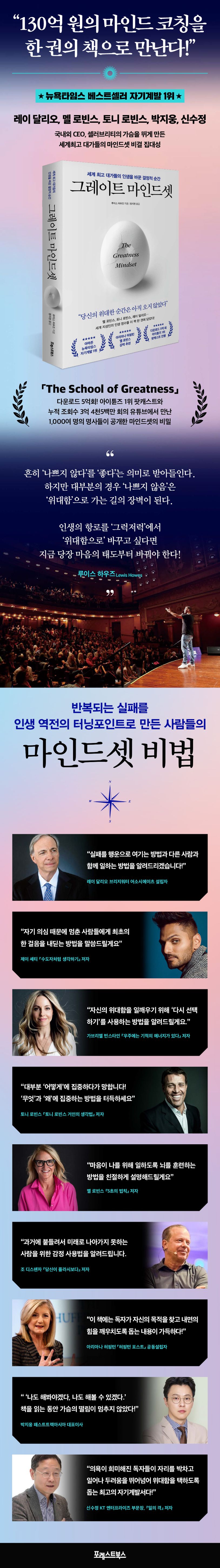 다운로드 5억 회를 기록한 화제의 팟캐스트 「The School of Greatness」를 10년 넘게 진행해 온 저자 루이스 하우즈는 팟캐스트에서 만난 1,000여 명의 명사들과의 대화에서 깨달은 ‘위대함의 법칙’을 한 권의 책으로 정리했다. 레이 달리오, 팀 페리스, 멜 로빈스, 토니 로빈스, 제이 셰티, 가브리엘 번스타인, 조 디스펜자 등 세계 최고의 대가들이 위대함의 적인 ‘세 가지 두려움(실패, 성공, 타인의 시선)’을 극복하고 반복되는 실패를 인생 역전의 터닝포인트로 만든 비결을 하나씩 풀어낸다. 저자가 제시하는 총 4단계 18개의 실행 플랜을 따라가다 보면, 내 안에 잠든 거인의 깨워 나만의 위대함을 찾고 발현하는 결정적 순간을 경험하게 될 것이다.