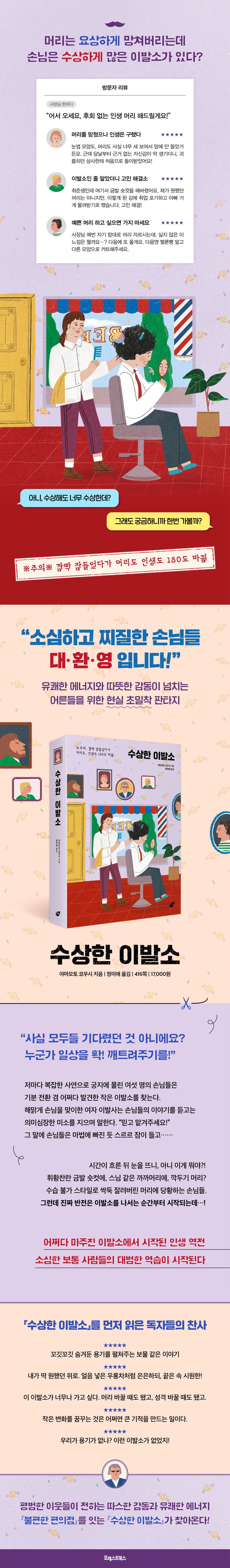 이 소설 속의 주인공들도 마찬가지이다. 머릿속과 마음속에 잔뜩 응어리진 고민을 싹둑 잘라내고 싶던 이들은 기분 전환이라도 할 겸 이발소를 찾는다. 그런데 해맑은 여자 이발사는 우는 아이 뺨이라도 때리듯, 말도 안 되는 머리 모양으로 손님들에게 또 다른 시련을 안겨버린다. “어때요? 잘 어울리죠!”라며 웃어 보이는 이발사에게 화도 못 내고 울며 겨자 먹기로 이발소를 나선 이들은, 어쩐지 속에서 용 솟는 용기와 패기로 새로운 인생을 찾아가는데…….