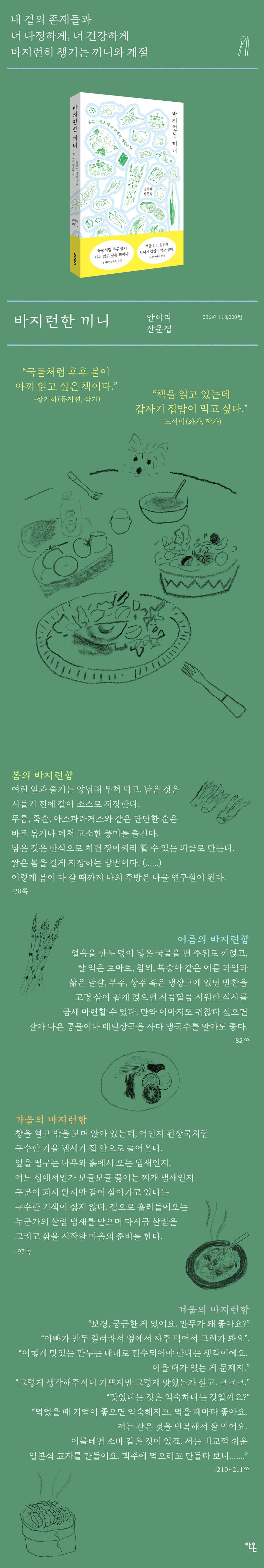 푸드디자인 스튜디오 ‘홈그라운드’를 운영하며 맞춤 케이터링, 팝업 매장과 각종 강연 등으로 대안적 먹을거리를 탐구하고 제시해온 안아라 요리 연구가의 산문집 《바지런한 끼니》가 안온북스에서 출간되었다. 안아라의 산문은 계절을 탐색하는 데 진심이다. 우리의 몸은 계절을 기억한다. 계절의 순환은 몸의 순환과 다름없다는 믿음으로 안아라는 제철 식재료를 다루고, 시절에 어울리는 끼니를 만든다. 그렇게 삶의 날씨를 음식으로 기억하고자 한다. 인생의 날씨가 언제나 맑음일 수는 없다. 우리는 함께 살던 동물을 잃을 수도 있고, 팬데믹 같은 예기치 못한 사태로 앞날이 캄캄해질 수도 있다. 그때마다 정성을 다해 만든 끼니는 우리를 위로해줄 것이다. 《바지런한 끼니》에는 계절과 요리가 담겼다. 그의 정갈한 글과 다정한 요리법은 독자에게 “한가로운 마음을 선물”(장기하)해주고, “갑자기 집밥을 먹고 싶”(노석미)게 한다. 그리하여 이 책은 우리를 더 다정하고 더 건강하게 할 것이다.