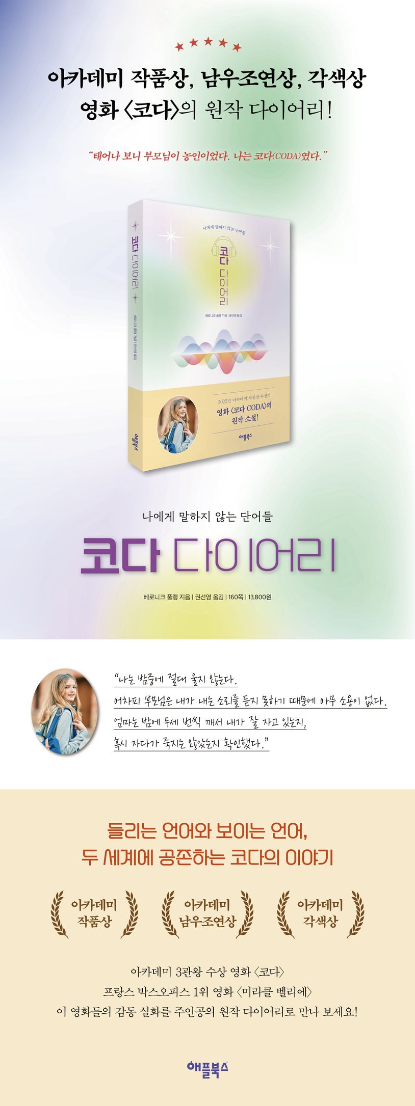 《코다 다이어리》는 청각장애를 가진 농인 부모의 자녀인 코다로 살아온 저자 베로니크 풀랭의 자전적 소설이자, 농인의 자녀로 태어나 어린 시절, 청소년기를 거쳐 성인이 되기까지의 성장 과정을 담은 일기장이다. 부모님의 출생 스토리와 청각을 잃게 된 과정도 담담하게 풀어놓는다.