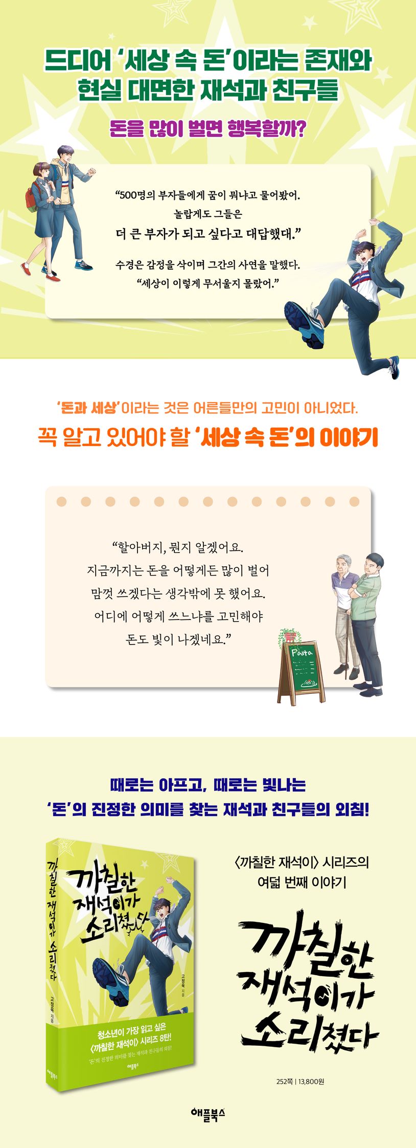 청소년들 사이에서 폭발적인 인기를 끌고 있는 ‘까칠한 재석이’ 시리즈가 여덟 번째 이야기 ⟪까칠한 재석이가 소리쳤다⟫(애플북스)로 돌아왔다. 이 시대 청소년들의 고민거리를 예리하게 감지하여 주제를 선정하고, 철저한 사전 조사와 현실감 넘치는 생생한 묘사를 통해 학생, 학부모, 교사의 사랑을 독차지하고 있는 〈까칠한 재석이〉 시리즈는 통통 튀는 매력의 주인공 재석이가 청소년의 목소리를 직접 대변하기에 시리즈가 거듭될수록 더 큰 열풍을 일으키고 있다. 이번에는 먹고살기 위한 평생의 고민거리지만 대개 진지하게 고민하지 않고 제대로 교육받은 적도 없는 돈 문제에 대해 다룬다.