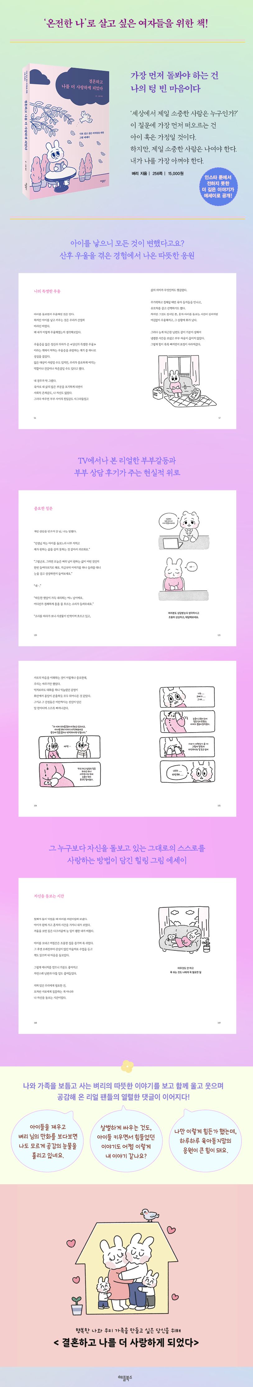 그림 에세이집 ≪결혼하고 나를 더 사랑하게 되었다≫는 전문직 여성이 결혼과 함께 육아와 살림을 전담하게 되면서 겪는 산후우울과 부부 갈등, 이를 치유하기 위한 상담의 기록이다. 저자는 긴 시행착오 끝에 부부가 각자 자기 모습을 잃지 않고 행복하게 살아가는 방법을 터득했다. 남편과 아내가 억지로 하나가 되려 하기보다는 각자 본연의 모습으로 바로 서서 서로를 지지해주는 가장 가까운 사람이 되기로 말이다.