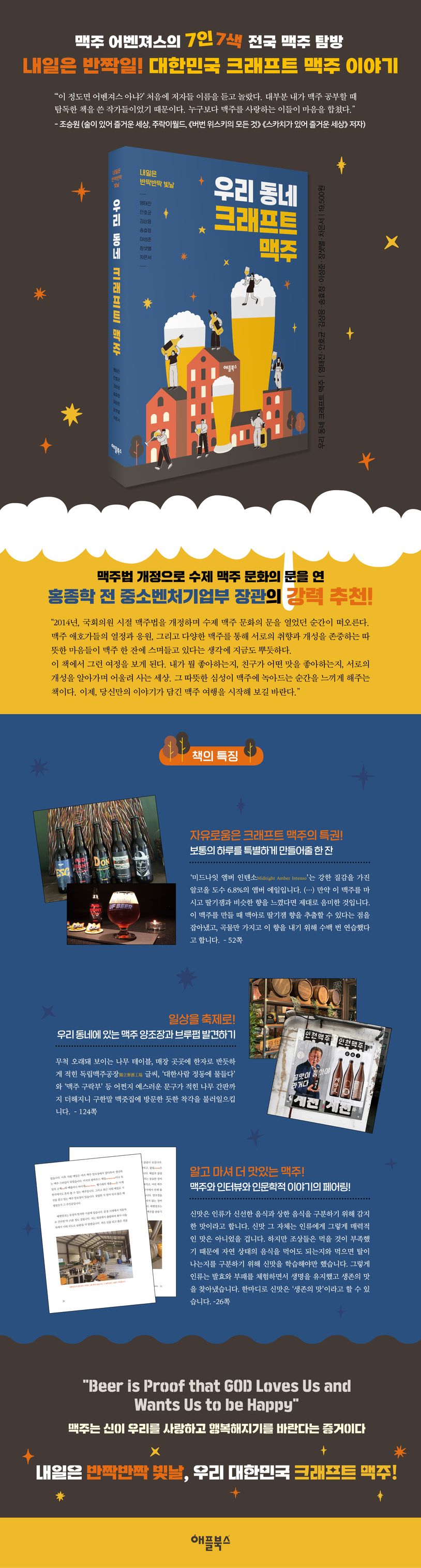 맥주에 곁들일 이야기도 풍성하다. 왜 영국에서도 아주 전통 펍에나 있는 ‘카스크 에일’을 한국에서 판매하는지, 어쩌다가 감자와 팥으로 맥주를 만들 생각을 했는지, 아니, 애초에 왜 한국에서 맥주를 직접 만들고 있는지 등 맥주를 만드는 사람들의 이야기는 그들이 만드는 맥주와 훌륭한 페어링을 이룬다. 이야기에 귀 기울이며 맥주 한 잔 하다보면 “한국 맥주는 다 밍밍하잖아. 시원한 맛에 마시는 거지”라는 생각에서 벗어나, 새로운 맥주의 세계를 만나게 될 것이다.