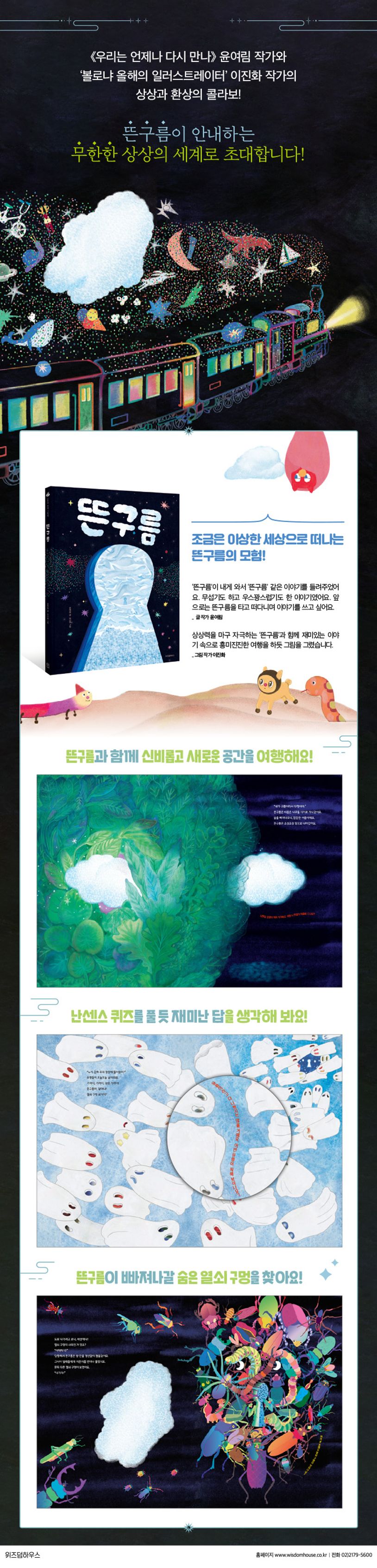 뜬구름이 경계 없는 상상의 세계로 초대합니다. 신비로운 공간을 여행하는 여행기를 읽듯 흥미로운 이야기가 펼쳐집니다. 각 공간에서는 뜬구름처럼 엉뚱하고 재치 넘치는 질문도 하나씩 등장합니다. 난센스 퀴즈를 풀 듯 자신만의 기발한 대답을 생각해 봐요. 뜬구름이 들어가고 나갈 열쇠 구멍도 숨은그림찾기를 하듯 찾으며 환상의 세계로 떠나 보아요!