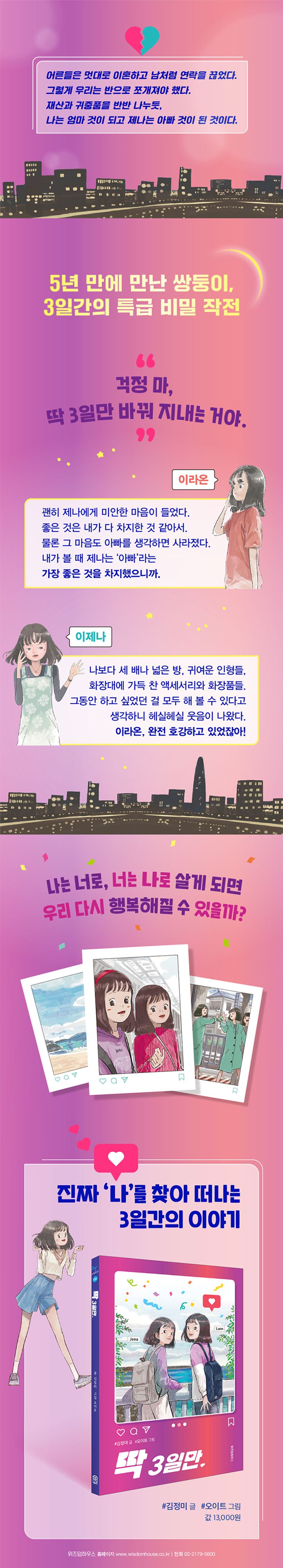 부모님의 이혼으로 떨어져 살게 된 라온과 제나. 둘은 미처 몰랐다. 쌍둥이 자매가 자신이 꿈꾸던 삶을 살고 있을 줄은! 아빠와 함께 바닷가 마을에 사는 제나가 부러운 라온과, 엄마와 함께 화려한 도시에서 사는 라온이 부러운 제나는 딱 3일간 바꿔 살기로 결심한다. 그러나 막상 마주한 서로의 삶은 생각처럼 화려하지만도, 평온하지만도 않다. 오히려 문제투성이다. 서로의 삶을 살면 마냥 행복할 줄 알았던 라온과 제나. 자매는 소망대로 예전처럼 다시 행복해질 수 있을까?