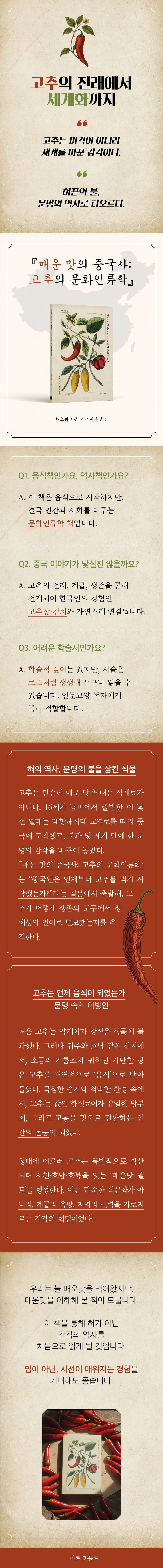 한국은 매운맛의 나라다. 그러나 그 매운맛의 기원과 감각의 의미를 문화적으로 탐구한 책은 드물다. 『매운맛의 중국사』는 한국 독자에게 매운맛이라는 감각의 인류학을 선사한다. 한국의 고추장 문화, 중국의 마라 문화, 동남아의 칠리 소스까지 모두 식탁 위의 감각이자 정체성이다. 이 책을 읽다 보면, 매운맛이 단지 혀의 쾌감이 아니라 사회적 열정, 집단적 욕망, 생존의 기술이었음을 깨닫게 된다.