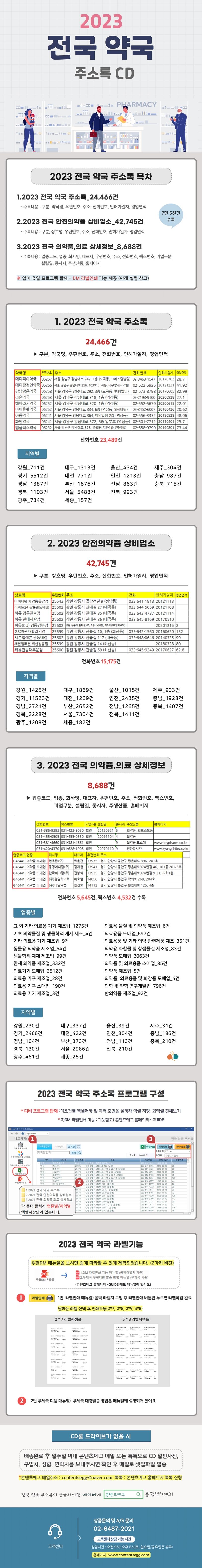 전국 약국, 안전의약품 상비업소, 의약품 제조업, 의약품 도매업, 의료기기 제조업 등 약 7만 5천건 주소록이 수록되어 있다. 전국 약국 주소록은 업종별, 지역별 엑셀 저장이 가능하며, DM 라벨기능이 탑재되어 있다.